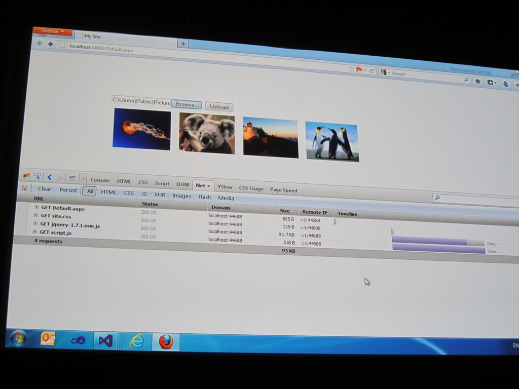 Hier werden verschiedene Files (mit Wildcards) in das Bundle gepackt. Mit .Render werden Files hinzugefügt. Das Demo läuft so wesentlich schneller (von 25 requests auf 13 request und es wurde viel Bandbreite gespart). Beim rendering wird ein “Fungeprint” (=Hashcode) des Files als Parameter ?v=xyz angehängt. somit wird sichergestellt, dass das Bundle neu geladen wird, wenn Änderungen erfolgt sind – sonst nicht. Serverseitig wird immer gecached. Das bedeutet maximale Performance.