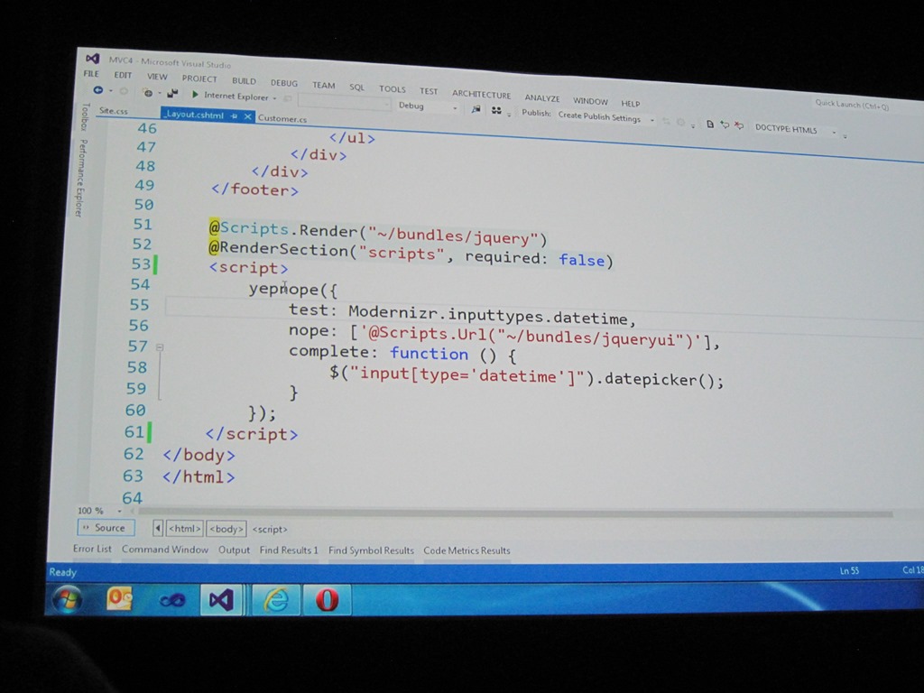 Zur Zeit unterstützt nur Opera alle HTML5-Input Types. BTW: MVC unterstützt Models automatisch – und erstellt somit die richtigen Input Data-Types. Wie kann man solche DataTime cross-browser erreichen? Eine Methode ist: yepnope():