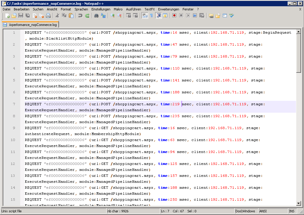 Das Script wird gestartet und nach ein paar Sekunden Laufzeit (und einigem Herumklicken in der Website) mit STRG+C abgebrochen. Das erzeugte Logfile (iisperformance_nopCommerce.log mit Zeilenumbruch zur vollständigen Lesbarkeit) liefert die Requests mit ihrer Antwortzeit: