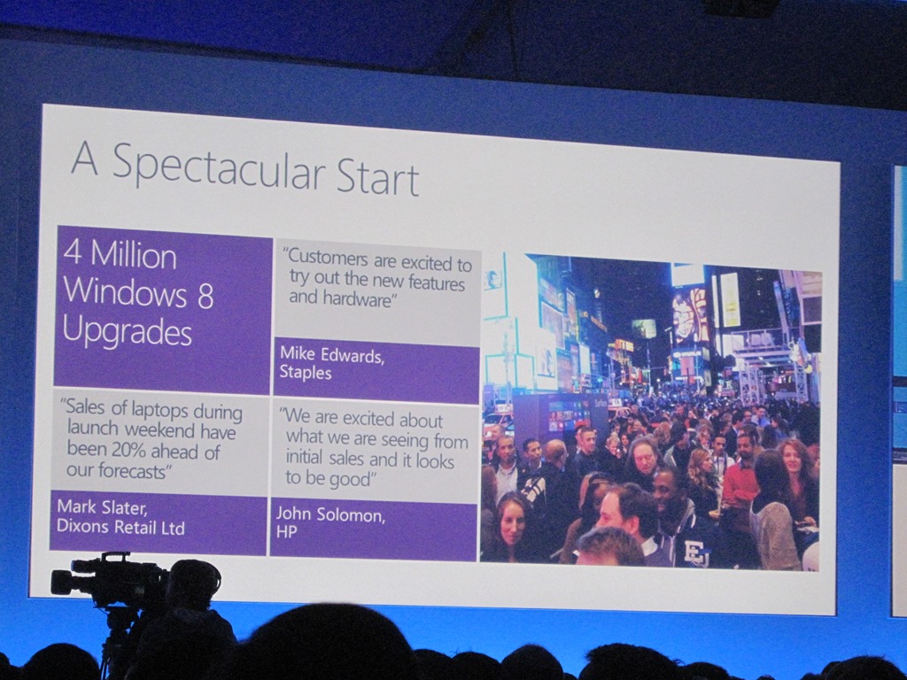 Seine Botschaft: In nur drei Tagen (!) wurden 4 Millionen Upgrades von Windows 8 verkauft! Wow!