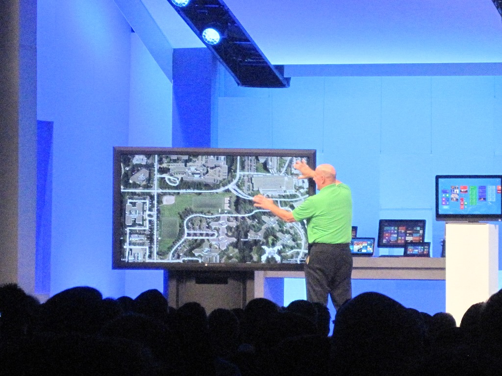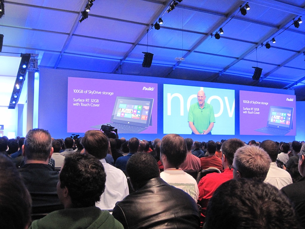 Steve Ballmer eröffnet die Konferenz und zeigt selbst (!) Windows 8 auf verschiedenen Geräten. Er beginnt mit einem sportlichen 82-Zoll Touch-Bildschirm und zeigt danach verschiedene Tablet-PCs und Windows Phones und natürlich Microsoft Surface.
