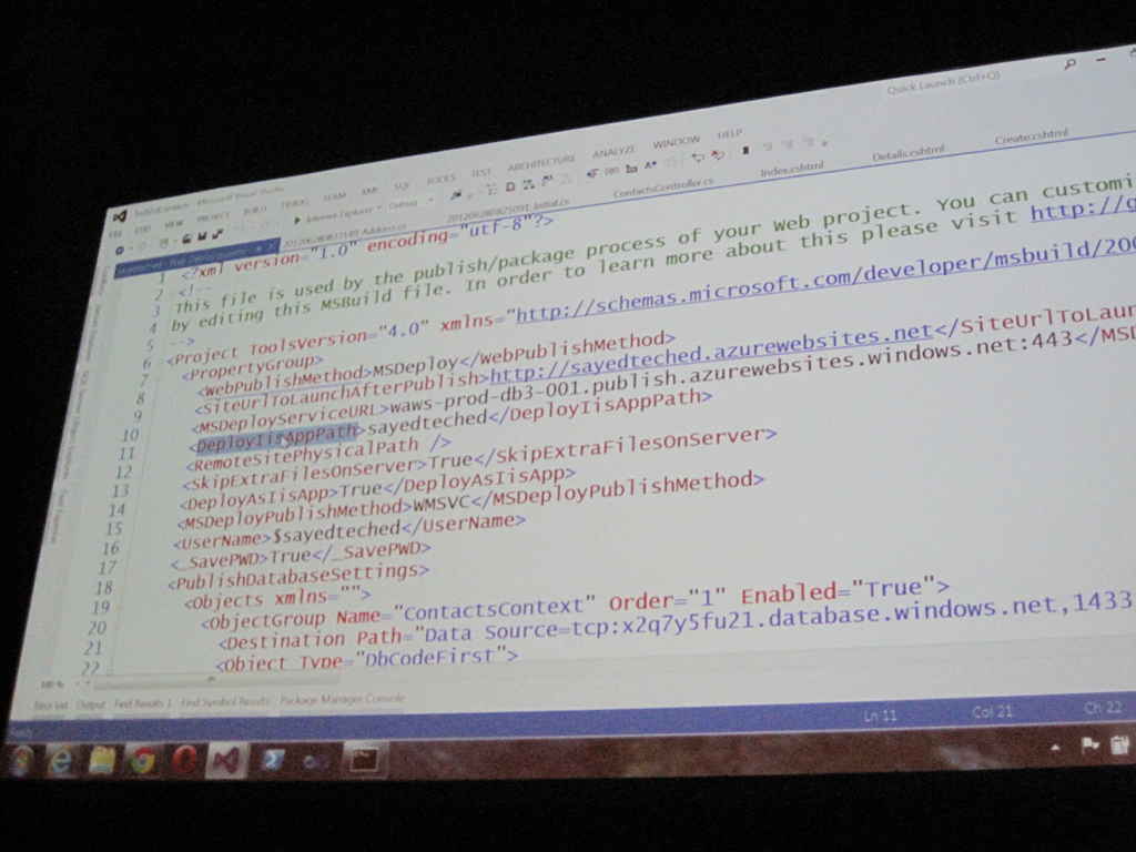 Sayed Ibrahim Hashimi (@SayedIHashimi) von Microsoft zeigte in dieser Session, wie ASP.NET Web-Applikationen für den Betrieb in der Cloud angepasst werden können. Windows Azure als PaaS bietet wesentlich mehr Möglichkeiten als simples Web-Hosting. Azure bietet u.a. BLOB storage (binary large object), SQL Azure, Service Bus, Caching, und viele weitere Funktionen. Hier (DEV306)gehts zur Session Beschreibung.