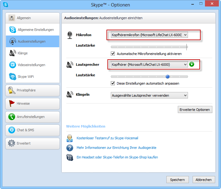 Wenn es nicht wie oben gleich funktioniert, können die zu verwendenden Geräte in Skype im Menü Aktionen / Optionen in den Audioeinstellungen eingestellt werden: