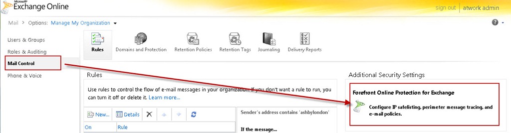 Simply click on Exchange Online / Mail control / Forefront Online Protection for Exchange.