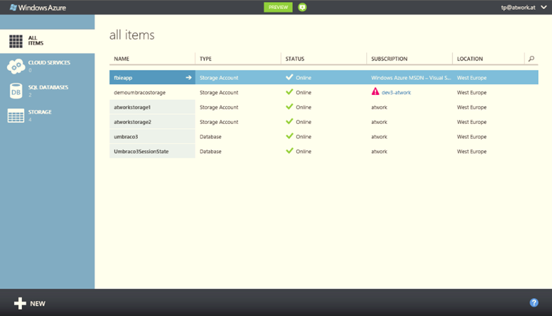 An erster Stelle kommt für mich zunächst das neue Verwaltungsportal von Windows Azure. Dieses wurde mit Fokus auf Usability und Geschwindigkeit gänzlich neu geschrieben und kann im Preview-Status (https://manage.windowsazure.com) verwendet werden. Neben der neuen Oberfläche wurden Monitoring und Diagnosefunktionen hinzugefügt.