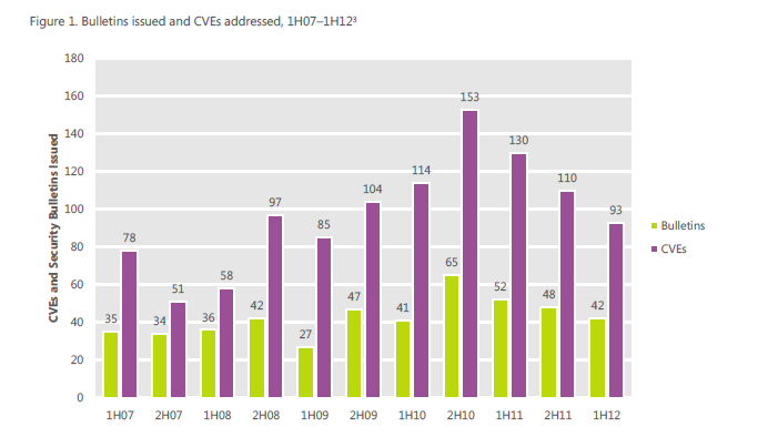 Gut zu wissen: von Juli 2011 bis Ende Juni 2012 wurden von Microsoft insgesamt 90 security bulletings veröffentlicht, die 203 individuelle Bedrohungen adressierten. 50% davon erlaubten eine Remote code execution –> im Jahr davor waren es noch rund 60%.