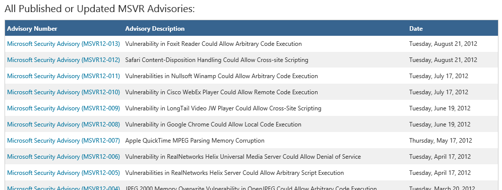 Der Microsoft Security Response Center (MSRC) Report 2012 wurde vor kurzem in Las Vegas vorgestellt. In diesem Report werden aktuelle Sicherheitsthemen behandelt. In diesem Report finden sich Statistiken zu den von Microsoft veröffentlichten Sicherheitsaktualisierungen, aktuelle Status zum Microsoft Active Protections Program (MAPP), Microsoft Exploitability Index, Microsoft Vulnerability Research (MSVR).
