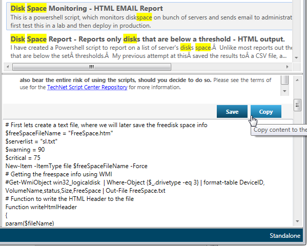 Die Anwendung ist einfach: Die Suche nach beispielsweise “disk space” liefert mehrere Ergebnisse – pardon, Scripts.