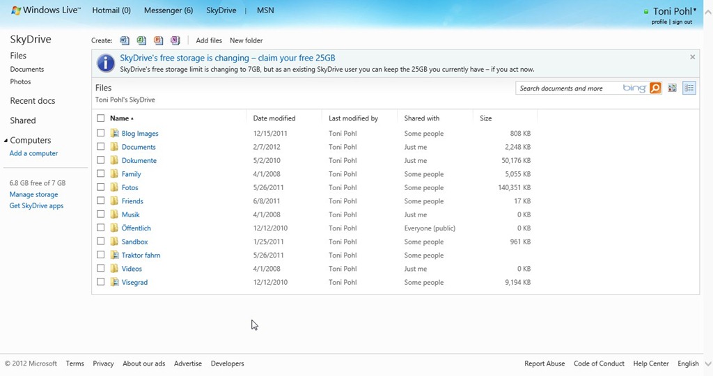 Bei Skydrive gibt es einige Neuigkeiten, wie das Windowsblog.at berichtet. Dazu zählt auch die Neuerung, dass der Onlinespeicher flexibel erweitert werden kann. Bisherige SkyDrive User haben 25GB Speicher zur Verfügung, neue SkyDrive User haben 7GB und können diesen beliebig erweitern. Für alle Benutzer, die SkyDrive bereits jetzt im Einsatz haben, gibt es derzeit ein Angebot, die 25GB zu erhalten. Hier zeigen wir Ihnen, wie. Zuerst bitte unter www.live.com mit Ihrem Live Account anmelden und dann auf den Menüpunkt SkyDrive klicken.