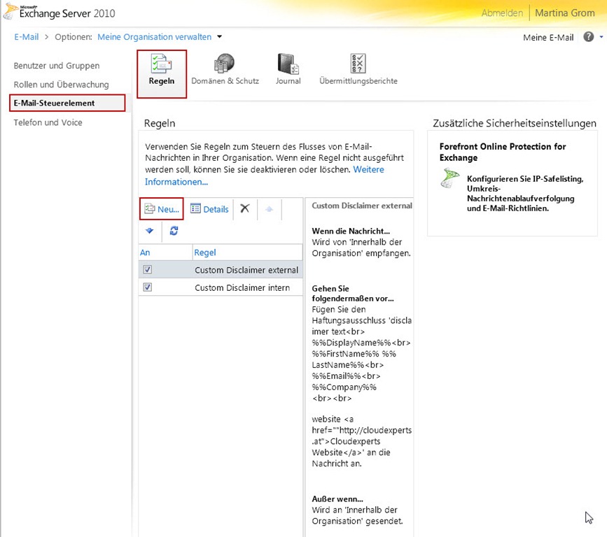 Für die Einrichtung verwende ich hier eine Regel. Diese finden Sie unter den Exchange Administratoroptionen, Menüpunkt E-Mail Steuerelement / Regeln.