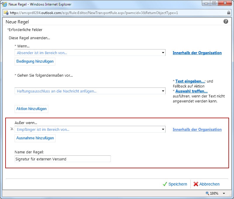 Bei weiteren Optionen legen Sie folgendes fest: “Außer wenn….Empfänger ist im Bereich von…Innerhalb der Organisation”. Danach geben Sie der Regel noch einen Namen.
