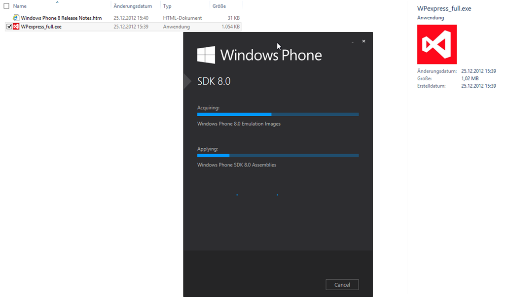 *Achten Sie in diesem Fall auf die richtige Sprache, passend zur bereits installierten VS 2012-Version!Ohne vorhandenes Visual Studio 2012 Professional, Premium oder Ultimate installiert das Windows Phone 8 SDK eine eigene Microsoft Visual Studio Express 2012 Edition für Windows Phone. Neue WP8-Apps werden durch Starten von VS Express erstellt.