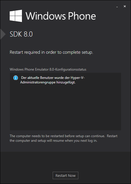 “This Product can only be installed on Windows 8 or later 64-bit Machine.”Das SDK installiert Emulatoren für verschiedene Bildschirm-Auflösungen des Windows Phones und liefert weitere Test-Tools für die Entwicklung.
