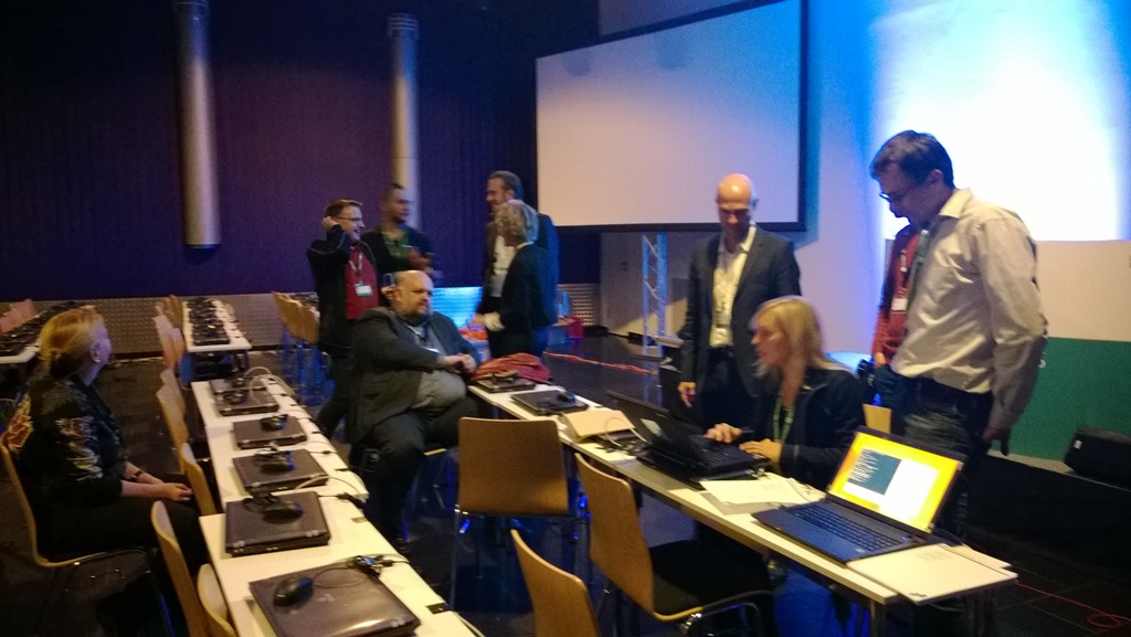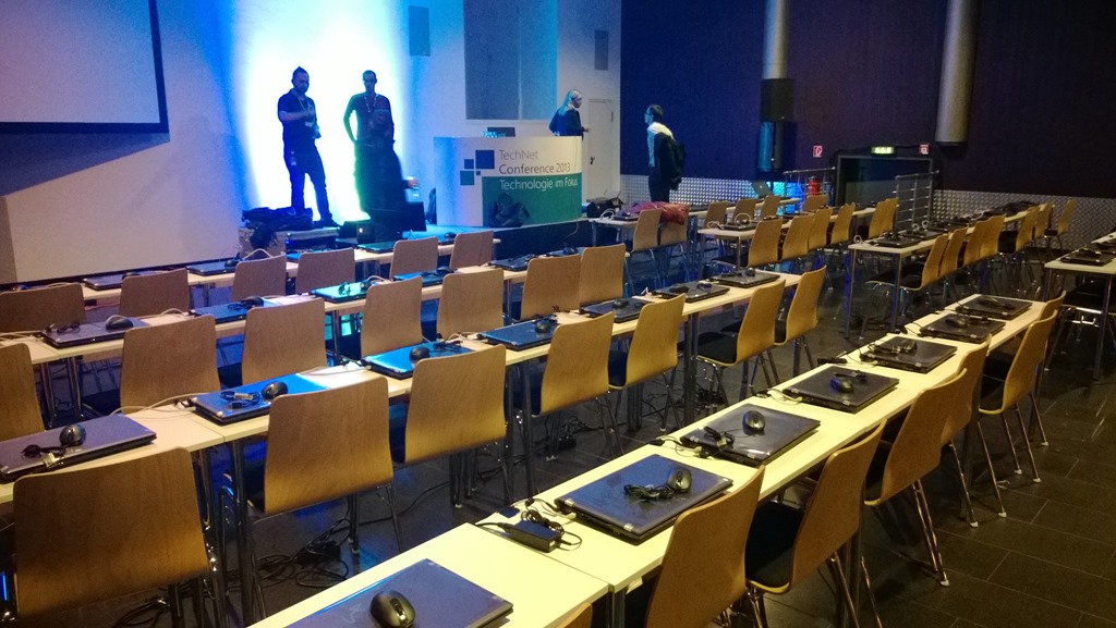An Tag zwei wurde einer der Räume kurzerhand mit 60 Notebooks für die Workshops umgebaut, das war doch etwas Aufwand für die Vortragenden und viele Helfer die Verkabelung und das Netzwerk für die Sessions zu planen und aufzubauen und noch fleißig die Windows 8.1 ToGo USB Sticks zu produzieren.