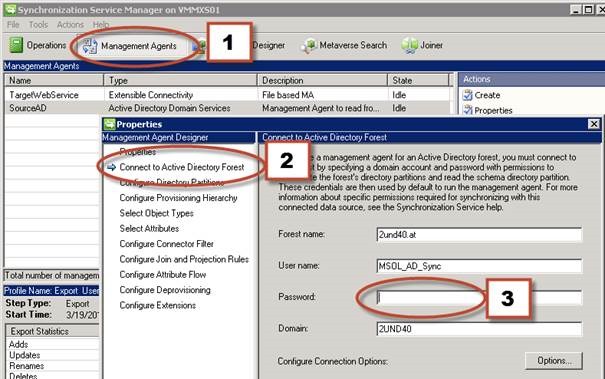 Dort ist im Bereich der Management Agents der ServiceAccount für den Directory Access einzutragen. Falls noch unbekannt – Passwort einfach resetten (Der User liegt im BuiltIn Container der Domain) und hier eintragen.