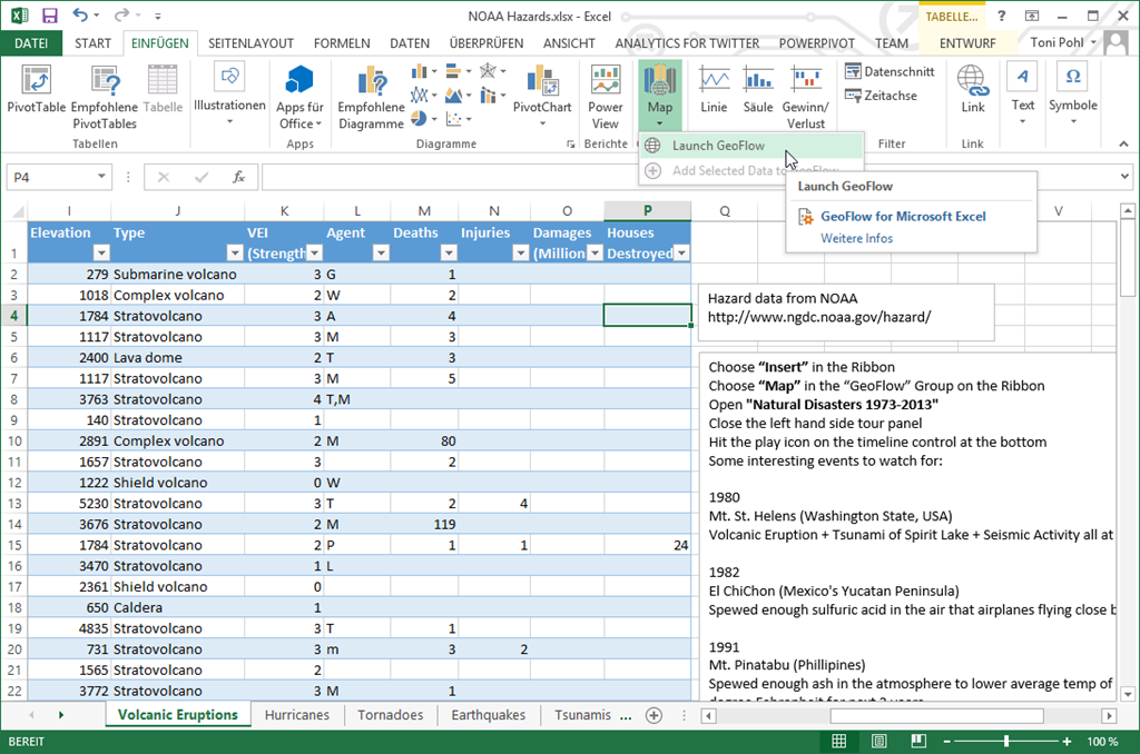 Es gibt auch eine kurze Anleitung rechts von der ersten Tabelle. Zunächst wird im Ribbon Einfügen/Map/Launch GeoFlow (huch, hier steht noch der alte Projektname…)* *ausgewählt.