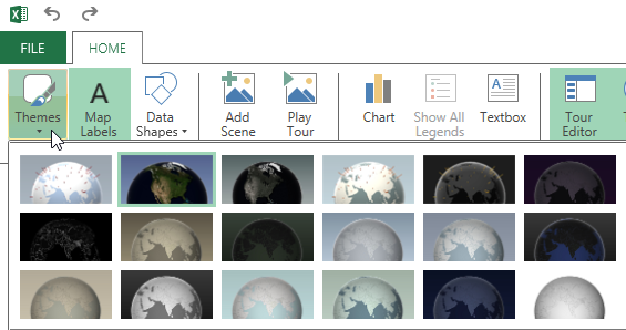 Jetzt folgt nach kurzer Analyse die Power Map. Hier werden Ereignisse in der Karte dargestellt werden. Mit den Themes kann das Aussehen der Karte bestimmt werden, mit Map Labels die Anzeige der Länder, Regionen und Städte.