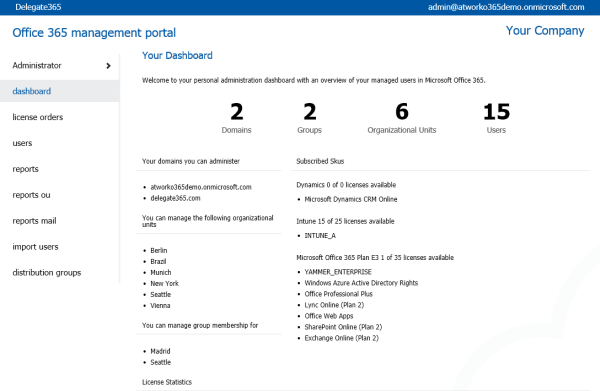 Typical customers of Delegate365 are larger businesses, companies with some departments or locations, franchisers, educational facilities, schooling, clubs, associations and every group who uses Microsoft Office 365™ and wants to use delegated administrators for managing only their own units.