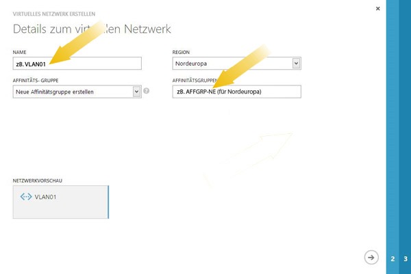 Als erstes erstellt ihr in eurem Windows Azure ein neues Virtuelles Netzwerk. Ihr werdet hier im Schritt 1 mit einigen Dingen wie z.B. dem Netzwerknamen – hier gebt ihr ganz einfach einen fiktiven Namen für euer neues virtuelles Netzwerk an und Affinitätsgruppen – sind die Zusammengehörigkeit der einzelnen Komponenten (Erstelle ich hier also einen Storagebereich/VM/etc. in einer anderen Affinitätsgruppe, so kann dieser nicht mit diesem VLAN genutzt werden) belästigt.
