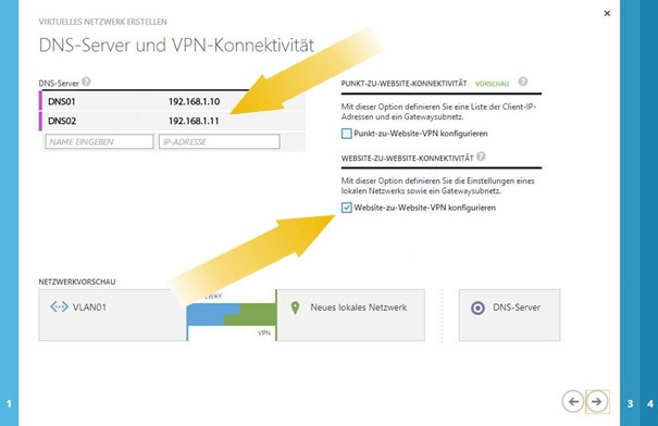 Als nächstes gibt man seine bestehenden On-Premise oder schon in Windows Azure befindliche DNS Server an. Zusätzlich setzt man den Hacken für Site-to-Site VPN konfigurieren.