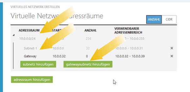 Im letzten Punkt definieren wir unseren Adressraum für das Windows Azure Netzwerk. Hier können bei Bedarf auch weitere Subnetze hinzugefügt werden. Für VPN Verbindungen benötigen wir hier noch zusätzlich ein eigenes Gateway Subnetz welches vom Gateway Service verwendet wird.