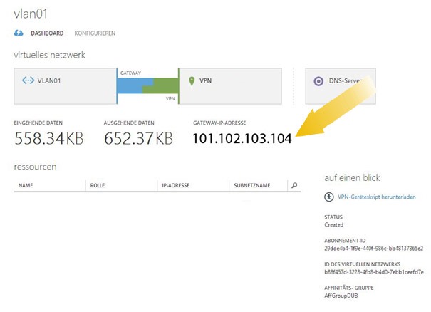 Nach dem klicken auf Ok, könnt ihr euch mal eine gute Tasse Kaffee gönnen und nach ca. 15 min solltet ihr die Gateway-IP-Adresse im Dashboard vorfinden. Diese IP-Adresse benötigt ihr nun auf eurer On-Premise VPN Gegenstelle.