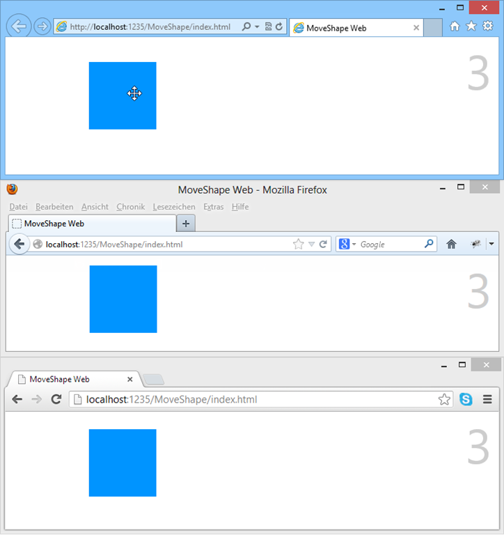 Das Ergebnis in drei verschiedenen Browsern: Das Verschieben der blauen Box in einem beliebigen Browser ändert sofort die Position in allen anderen Browsern. Ein cooles Demo, das zeigt, dass der Nachrichtenfluss zwischen Server und Clients einwandfrei funktioniert.