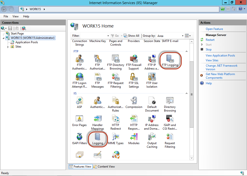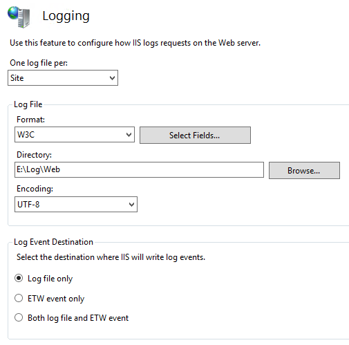 IIS loggt seit jeher in das Filesystem. Das macht vor allem aus Performance-Gründen Sinn. Die Logging-Einstellungen können nach eigenem Bedarf angepasst werden, auf Serverebene für Web und FTP-Traffic oder dann einzeln pro Website. Zumeist legt man die gewünschten Eigenschaften einmal pro Server fest.