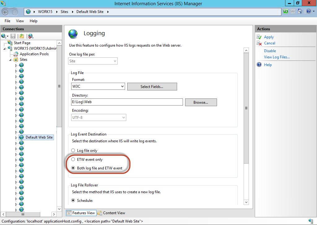 In IIS 8.5 können Weblogs auch direkt in das Event Tracing von Windows (ETW) geschrieben werden – sprich in die Ereignisanzeige. Damit können zum Beispiel IIS-Events in Echtzeit ge-monitored werden. Bei klassischen Logfiles kann es je nach Auslastung 30 Sekunden dauern, bis das Ereignis in dem Logfile geschrieben wird. Im Gegensatz zum file-basierten Logging werden die Ereignisse sofort in das Eventlog geschrieben.