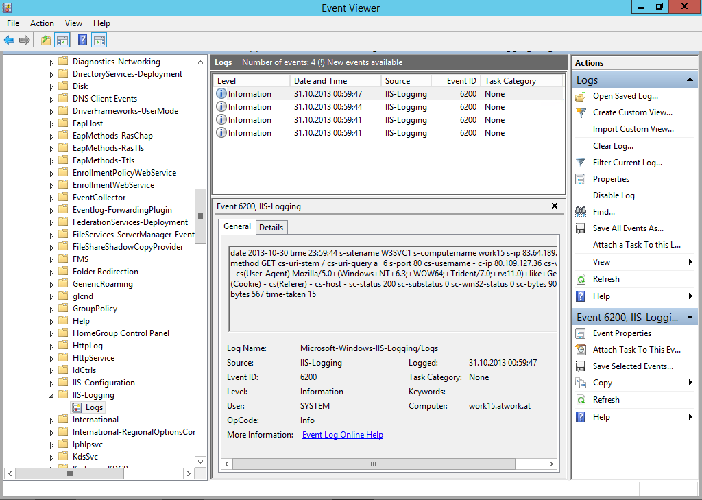 Die neuen Funktionen von IIS 8.5 bringen unter anderem neue Logging-Mechanismen. Es gibt zwei neue Verbesserungen im Logging. Nun können zusätzliche Felder mitgespeichert werden und das Logging kann nun in das Windows Ereignisprotokoll geschrieben werden.