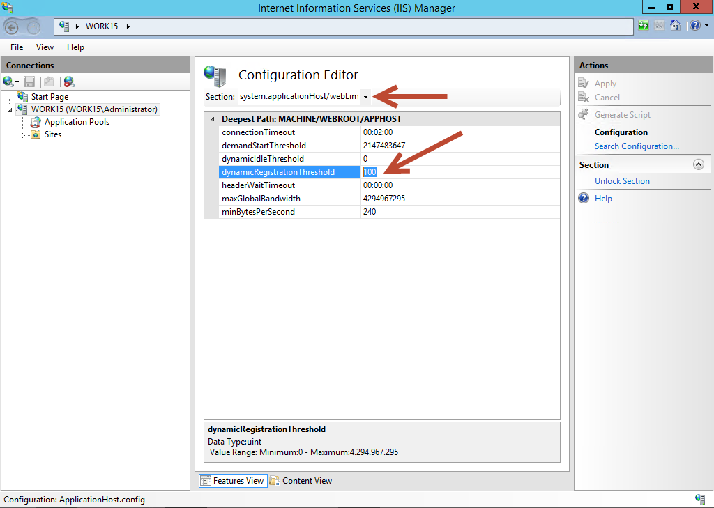 …und im Editor-Modul die Section system.applicationHost/webLimits. Hier kann das Setting dynamicRegistrationThreshold mit dem Standardwert 100 verändert werden. WAS muss restarted werden, damit die neue Einstellung greift.