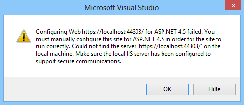 Mir ist es so ergangen. Man öffnet nichts ahnend ein Projekt aus dem TFS und Visual Studio beschwert sich schon beim Öffnen: “Configuring Web https://… for ASP.NET 4.5 failed. You must manually configure this site for ASP.NET 4.5 in order for the site to run correctly.”. Die Solution öffnet brav, nur ist sie nicht lauffähig.