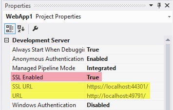 Run zum Testen, danach SSL Enabled auf True setzen. Damit wird automatisch die SSL URL eingetragen. Beim Starten folgt natürlich noch https://localhost:49791/. Das können wir leicht ändern, indem wir einfach die https-Adresse in den Project-Eigenschaften hinterlegen: https://localhost:44301/