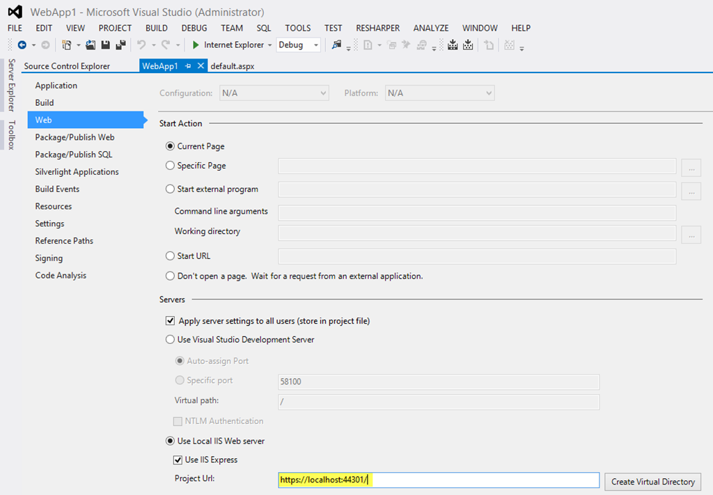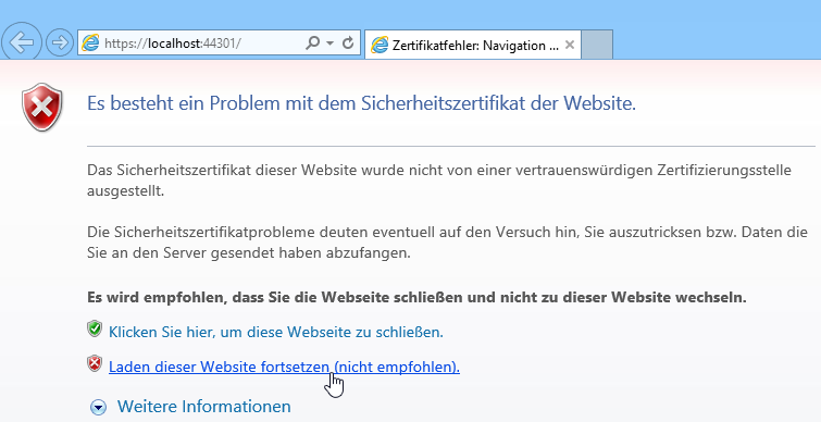 Klar, das Verhalten erscheint mit der Fehlermeldung beim Öffnen der WebApp logisch. Nur, wie bringe ich IISExpress dazu, mit HTTPS zu arbeiten?