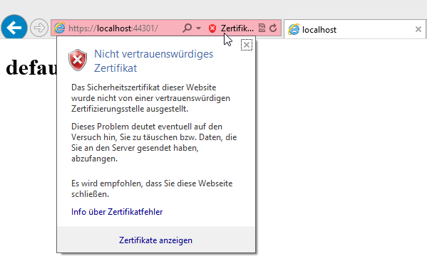…und das Web mit F5 starten: VS öffnet den Browser mit der https-Adresse. Der Benutzer muss natürlich dem ausgestellten Zertifikat vertrauen und die Verwendung für diese Session zulassen: