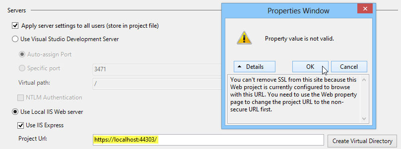 Also vor dem Umstellen die http-Adresse eintragen, Projekt speichern und dann SSL Enabled = False setzen.