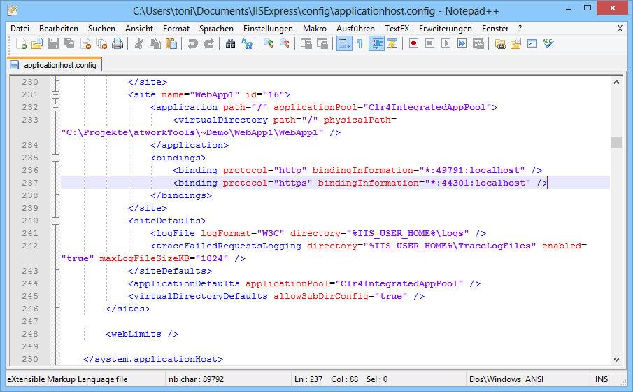 In applicationhost.config merkt sich IISExpress die Projekte und deren Websettings für das Hosting. Natürlich können die Bindings für die Webprojekte auch hier manuell angepasst werden: