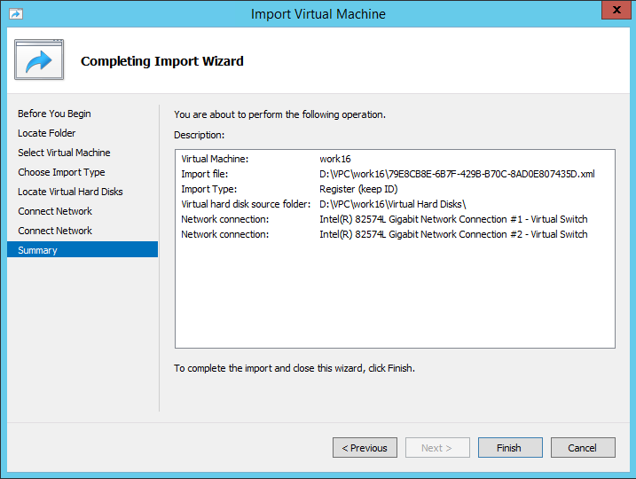 The rest behaves as expected… reuse the existing VM-ID, locate the existing VHDs (D:\VPC\work16\Virtual Hard Disks), connect the NIC and so on.