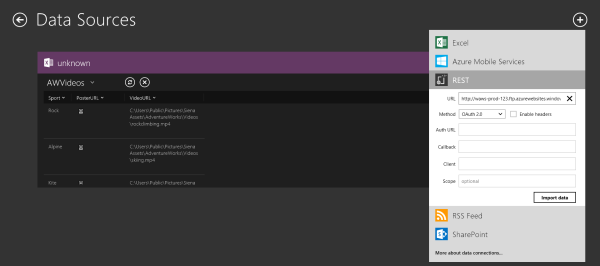 Als Datenquelle können verschiedene Datenlieferanten ausgewählt werden. Sogar REST mit OAuth 2.0 Authentifizierung, SharePoint und – sehr cool – Azure Mobile Services sind dabei. Diese können dann als Datenquelle für Lists, Dropdowns und Co. verwendet werden.