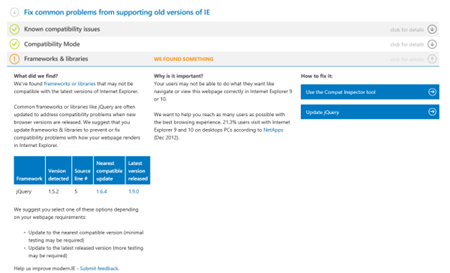 Beim Klick auf die Meldung “We found something” informiert modern.IE über die Details. Zum Beispiel verwendet die getestete Webseite noch eine ältere Version von jQuery (1.5.2). modern.IE zeigt dann die nächste kompatible Version (1.6.4) und die aktuellste Version (1.9.0).