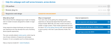 Ein weiteres Thema, das immer wichtiger wird, ist Responsive Web Design – die Webseite passt sich an den Browser und die Größe an und liefert so immer ein gut lesbares und funktionelles Benutzererlebnis. Nachdem immer mehr mit Smaprtphones gesurft wird, sollte die eigene Website diese Geräte optimal bedienen können. Auch diesen Punkt prüft modern.IE und gibt Hilfestellung für die Umsetzung.
