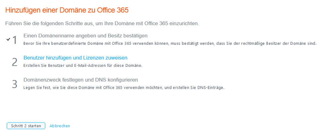 Ist auch das erledigt, können Sie Benutzer mit dieser Domain anlegen und im dritten Schritt dann den Domänenzweck festlegen und Ihre DNS Einträge abrufen. Sollten Sie die Benutzer über Directory Sync einbinden wollen, geben Sie hier an, dass Sie die Benutzer zu einem späteren Zeitpunkt hinzufügen wollen.