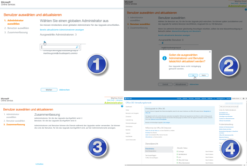 Mit der Schaltfläche JETZT TESTEN wechseln Sie in Ihr Office 365 Administrationsportal und können hier das Upgrade verschieben oder einige Benutzer vorab auf die neue Version wechseln. Dann haben Sie drei Schritte, die durchgeführt werden müssen: zuerst wählen Sie jene Administratoren aus, die vorab aktualisiert werden sollen. Danach die Benutzer, die Sie aktualisieren wollen, in der Zusammenfassung sehen Sie dann, wieviele Benutzer aktualisiert wurden.