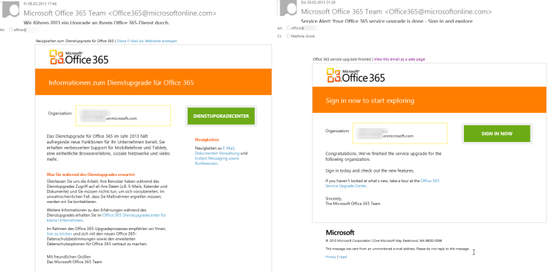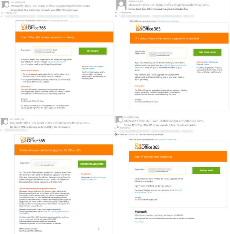 In den Benachrichtigungen erhalten Sie Informationen zur Umstellung. Sie erhalten je nach Tenant- und Clientkonfiguration 2-5 E-Mails. Manche sind auf Deutsch, andere sind auf Englisch, abhängig von Ihrer Tenanteinstellung. Wichtig ist, dass die Enduser keine Umstellungen machen müssen an ihren Clients oder den mobilen Endgeräten (sofern sie auf den aktuellen Versionen sind).
