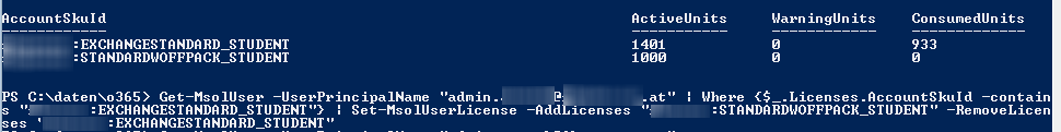 Get-MsolUser -UserPrincipalName admin@contoso.com | Where {$_.Licenses.AccountSkuId -contains “your-tenant-name:EXCHANGESTANDARD_STUDENT”} | Set-MsolUserLicense -AddLicenses “your-tenant-name:STANDARDWOFFPACK_STUDENT” -RemoveLicenses “your-tenant-name:EXCHANGESTANDARD_STUDENT”