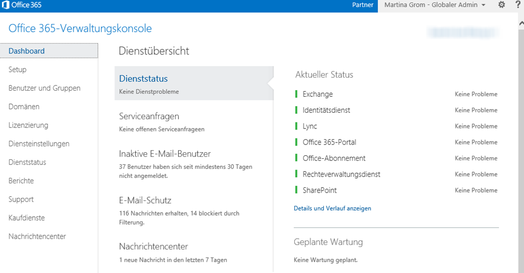 Die Dienste können Sie aber auch von hier über die GUI aufrufen und müssen sich keine komplizierten URLs merken. Dazu wechseln Sie links im Menü einfach auf Diensteinstellungen und schon kommen Sie von hier in die ECP (Exchange Verwaltungskonsole), zu SharePoint Online usw.
