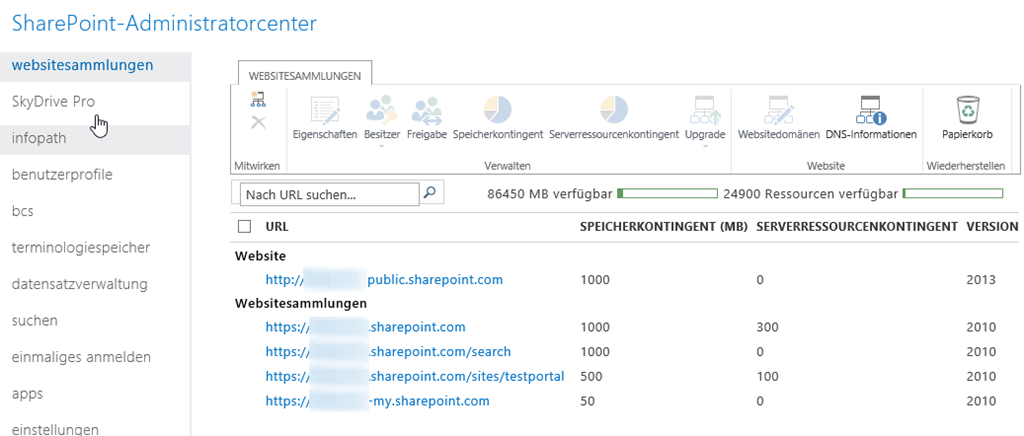 Wenn Sie nun in das SharePoint Administrationscenter wechseln sehen Sie nach einer Umstellung bereits, welche Sitecollections schon auf 2013 migriert sind und welche noch auf 2010 sind. Typischerweise sind die Public Facing Website auf 2013 vorhanden, die drei Hauptsitecollections (Root, Search und My-Site) aber noch in 2010.