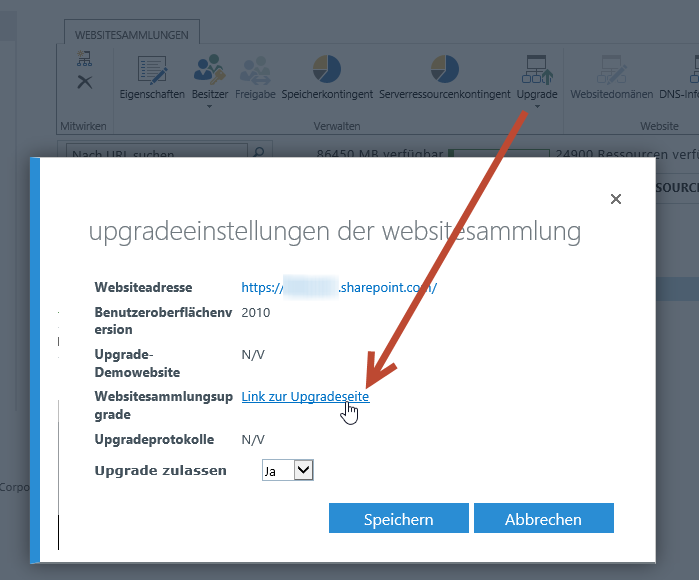 Um nun eine Sitecollection zu aktualisieren, wählen Sie diese vorher aus (Tipp: sollten Sie die Checkbox vor der Zeile nicht sehen, am besten alle Collections markieren und dann die anderen abwählen). Über das Icon Upgrade können Sie zu den Upgradeinstellungen wechseln und dort direkt den Link auswählen.
