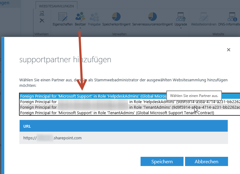 Wenn Sie delegierter Admin sind, bekommen Sie nun möglicherweise die Meldung, dass der Zugriff verweigert wurde. Ist ja auch klar, SharePoint kennt diesen User ja nicht. In diesem Fall fügen Sie sich vorher zu den Supportadministratoren hinzu. Dazu auf die Schaltfläche Besitzer / Supportpartner hinzufügen klicken. Dies bitte für jede zu aktualisierende Seite durchführen – auch für die MySite.