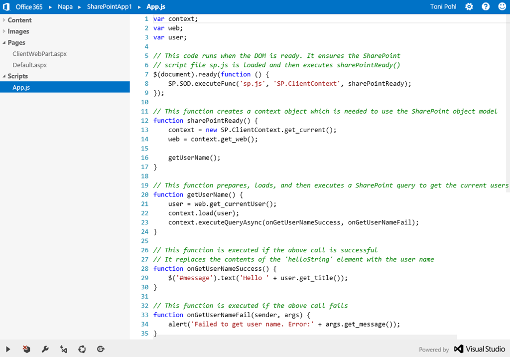 Das Beispiel zeigt somit, dass man sich als Developer mit Napa nicht um Security und ähnliches kümmern muss – die App wird in SharePoint gehostet und läuft automatisch im Kontext des SharePoint-Webs. Über die eingebundenen Bibliotheken ist genauso der Zugriff auf SharePoint-Listen möglich, dazu später ein eigenes Demo.